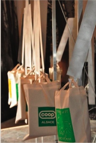Représentation même de la consommation, ces cabas sont l'objet d'une opération caritative : la société COOP a conclu un partenariat avec deux « ESAT » (Etablissements et Services d'Aide par le Travail).