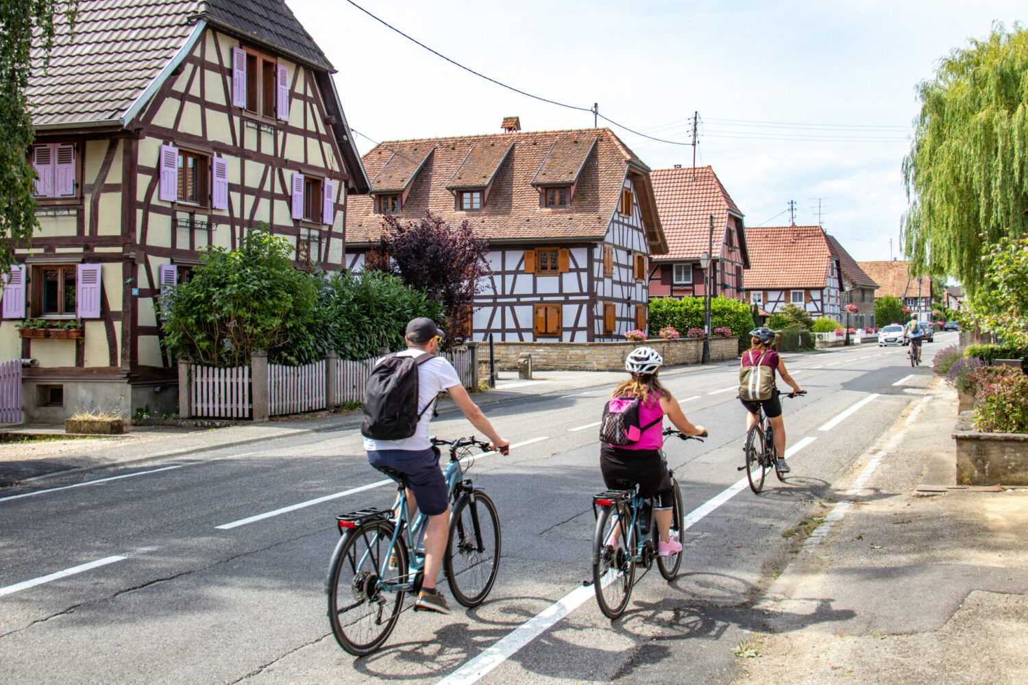 Cyclistes traversant un village alsacien