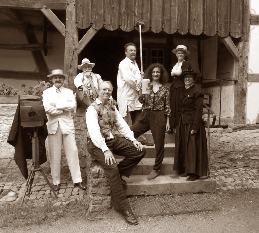 Photo de la troupe qui jouera un extrait de "L'Aigle et le Lion". En blanc avec canotier, Charles Spindler (joué par Jacques Hund), en photographe de 1911.